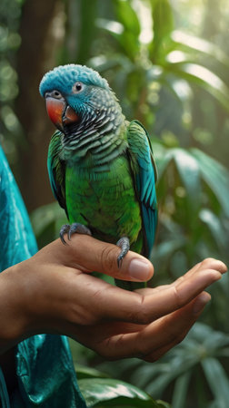 A vibrant turquoise-fronted amazon parrot perched gracefully on a hand in a lush tropical setting. Its beautiful plumage and curious gaze capture the essence of avian beauty and gentle companionship.