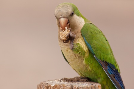 monk parakeet (myiopsitta monachus), or quaker parrot, feeding on the ground