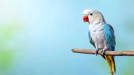 Colorful macaw perched on branch in tropical paradise with clear blue background. Generative AI