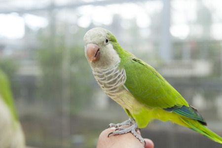Beautiful green Monk parrot sitting on shoulder of man. Guy is having domesticated friendly and affectionate Quaker parrot.