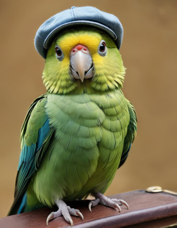 an iridescent green parrot perches on a wooden fence, showcasing its vibrant colors. the photo captures the essence of sky-blue and amber tones, reminiscent of beach portraits. the use of focus stacking and a wide-angle lens enhances the details, while the polished concrete background adds a modern touch. rendered in maya, this image embodies the beauty of nature and petcore aesthetics. ai generated