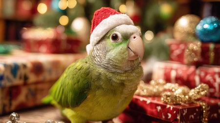 Cute green parrot wearing a Santa hat surrounded by colorful Christmas gifts. This festive setting creates a joyful and playful holiday atmosphere.