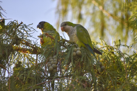 monk parakeet (myiopsitta monachus) and nanday parakeet (Aratinga nenday) feeding in a tree in the wild