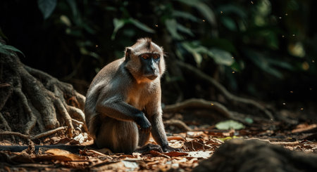 Jungle monkey in natural habitat surrounded by dense foliage and dappled sunlight