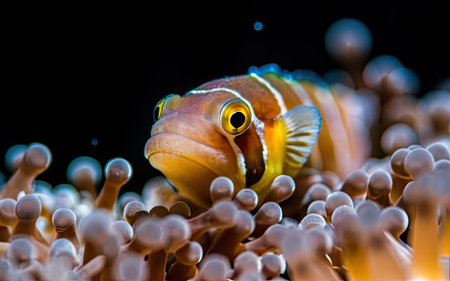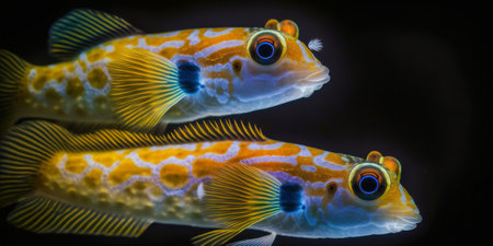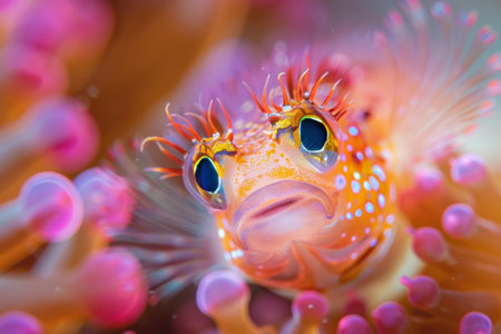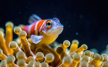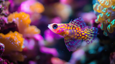 Vibrant neon goby fish peeking out from a colorful coral reef, showcasing the beauty of underwater marine life