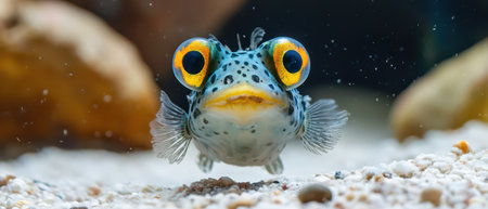 This lively underwater creature with large bright eyes swims amidst pebbles and colorful rocks showcasing its vibrant patterns.