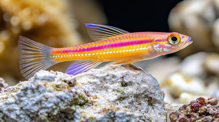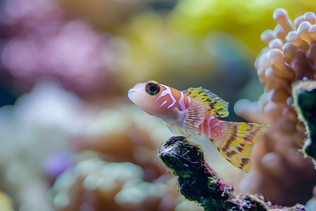 Colorful goby fish swimming among vibrant corals in saltwater aquarium environment
