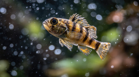 Small fish swimming under water wtih bubble and pink coral reef blurred background in aquarium. Sea animal with copy space for text.