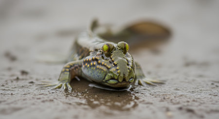 A detailed close-up of a mudskipper, an amphibious fish, resting on a wet mudflat. Its prominent, periscopic eyes are in sharp focus, showcasing its unique adaptation for seeing both in and out of water. This image captures the fascinating wildlife found in mangrove ecosystems.