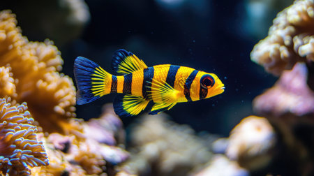 A striking yellow and black striped fish glides gracefully through a vibrant coral reef, showcasing the beauty and diversity of marine life. The scene captures the essence of underwater ecosystems and highlights the importance of ocean conservation.