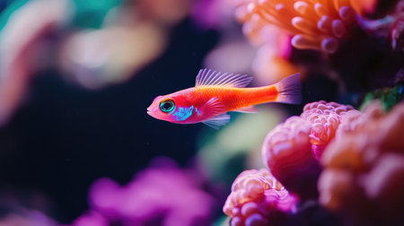 A close-up shot of a vibrant little fish in an aquarium at Chonburi, Thailand, swimming near brightly colored coral formations