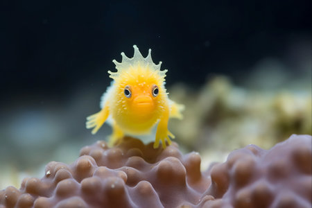 Adorable Microscopic Baby Yellow Frogfish Thriving on Hard Coral