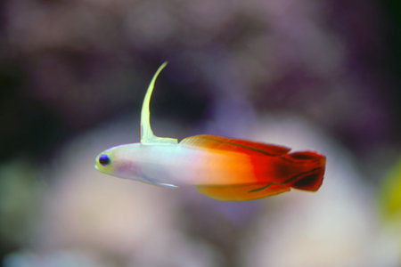 Purple cap firefish, Nemateleotris decora, darts through the saltwater on a tropical reef in the ocean. These colorful fish are purple and white with red.