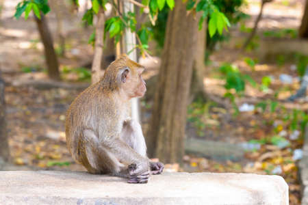 monkey in the wild. the monkey looks away. Monkey Island in Vietnam. Monkey Paradise. wild animals. blurred background. bright colors