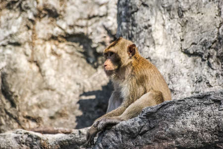 The portrait of monkey is sitting on the rock