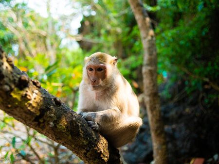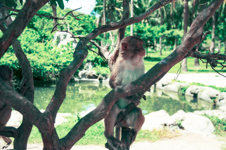 Macaque monkey sitting on the tree. Monkey Island, Vietnam, Nha Trang
