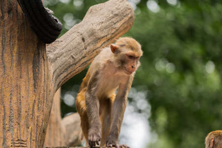 monkey looking and sitting on ground in the natural forest. Monkeys are mammals, they likes to live in the trees or their natural habitat. Wildlife nature. Mammal in green vegetation.