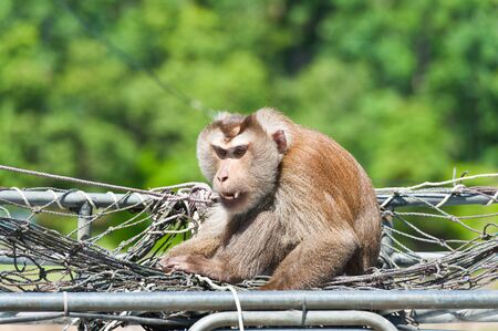 Monkey macaque chained on old tires in jungle on tropical beach on Phuket island Thailand in Southeastasia Asia.