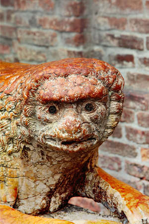 Stone sculpture of figure of dog-monster in Park of Branicki Palace and Medical University of Bialystok in Poland. Architecture of baroque mansions - historical memorial