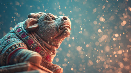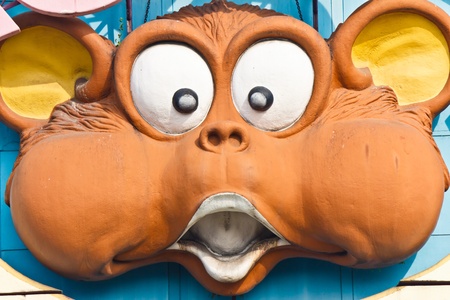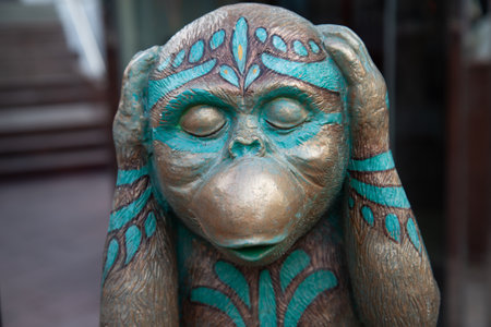 Street photo of a figure of a bright multicolored monkey with closed eyes of unusual color depicts various emotions. Moscow. Russia. June 2020.
