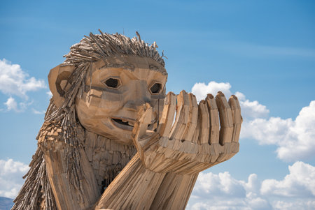 Large Wooden Humanoid Sculpture with Animal Features at Burning Man