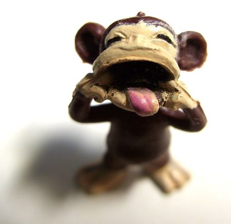 Three monkey,close up of hand small statues with the concept of see no evil, hear no evil and speak no evil.