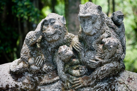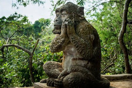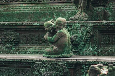 Sculptures of gods and demons carved from stone. Decor and decoration of ancient Hindu temples. Monkey Forest, a sacred temple complex in Ubud on the island of Bali, Indonesia.