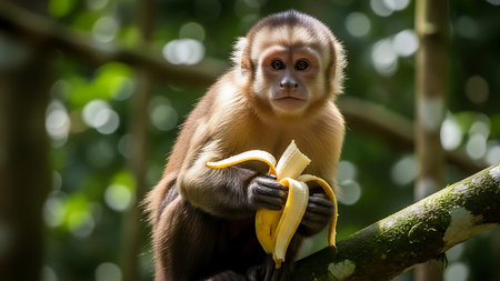 Curious and playful monkey holding a ripe yellow banana in a lush tropical jungle or rainforest setting The primate is sitting on a branch amidst green foliage and sunlight with a natural