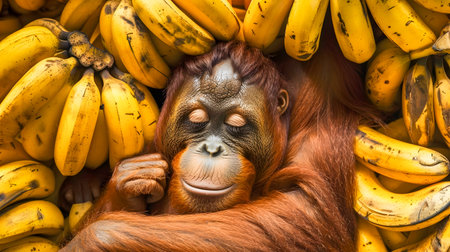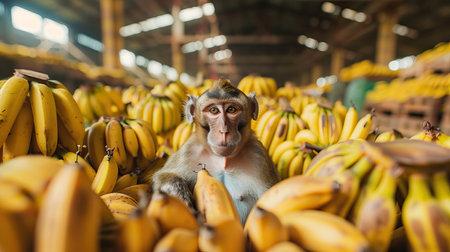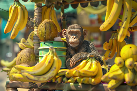 A monkey is sitting in front of a pile of bananas and coconuts. The bananas are piled high and the coconuts are scattered around the area with Generative AI