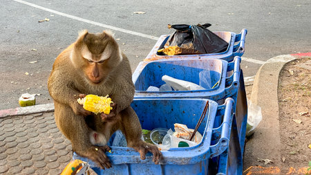 A monkey sits on a trash container and eats corn in Phuket, Thailand. This illustrates the interaction of wildlife with the urban environment and the impact of tourism.
