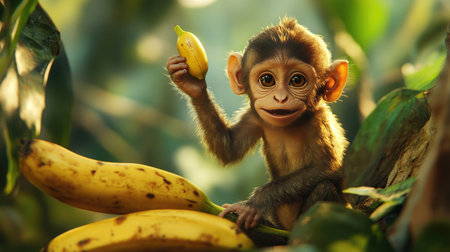 A charming baby monkey joyfully holds a small banana amidst a vibrant jungle. The enchanting scene features rich foliage and radiant sunlight, capturing a playful moment in nature.