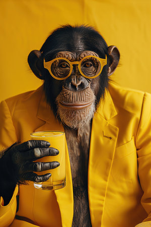 Chimpanzee in a yellow suit, holding a cocktail, wearing yellow glasses, yellow background