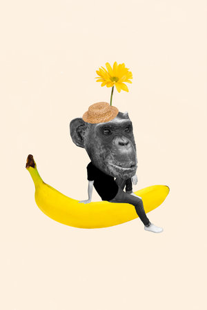 3d retro creative artwork collage of funny chimpanzee sitting big huge banan isolated beige color background