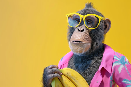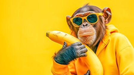 A chimpanzee in sunglasses and a yellow hoodie holds a banana, copy space