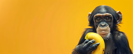 Close up portrait of a curious and mischievous chimpanzee or monkey holding a ripe yellow banana against a vibrant orange studio background The primate appears playful and engaged