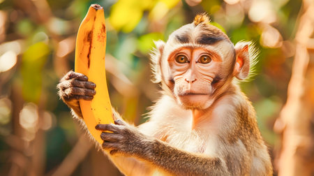 An AI-generated illustration of A monkey holding banana in a lush green with a blurry background