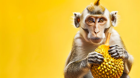 Curious Primate Monkey Examining and Holding Exotic Spiky Durian Fruit in Lush Tropical Environment Unique Wildlife Nature Photography with Copy Space