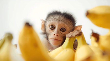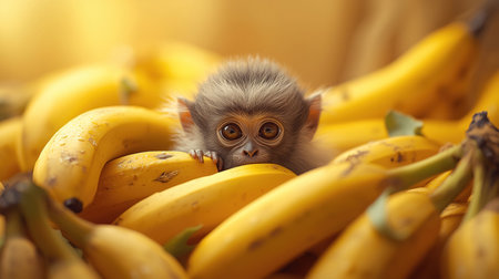 A small monkey with fluffy fur and large eyes is curiously looking over a stack of ripe bananas. The playful expression highlights its sense of adventure and interest in the fruit