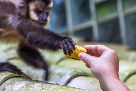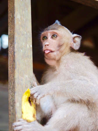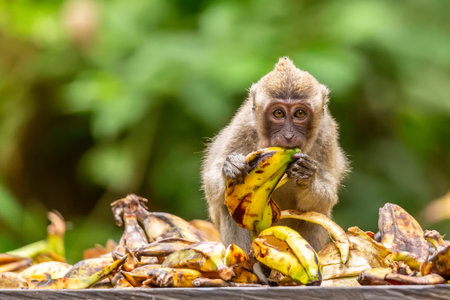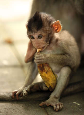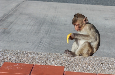 Baby monkey eat bananas in the jungle park garden.