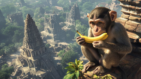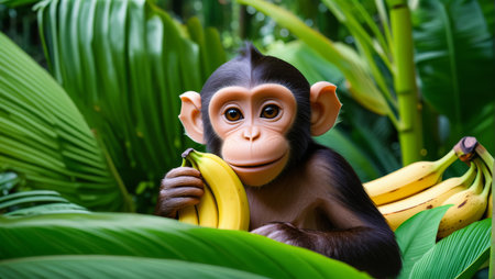 A young monkey sits peacefully in a lush jungle, holding a banana. The vibrant foliage and natural light create a serene atmosphere, perfect for wildlife themes.