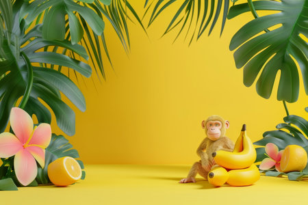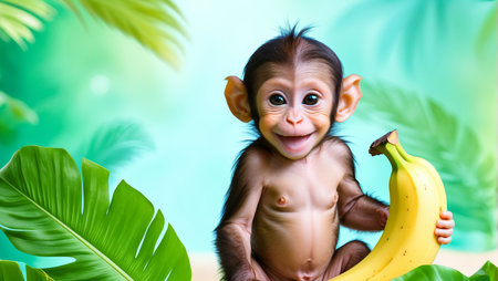 Adorable monkey with banana surrounded by tropical leaves.