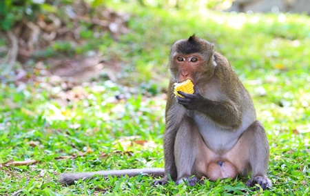 Macaque monkey eating corn