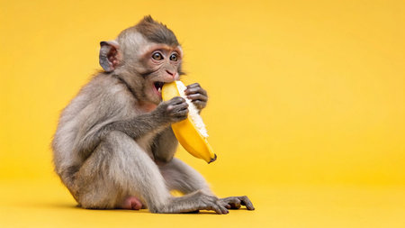 A primate is seated on a yellow background, eating a banana, copy space