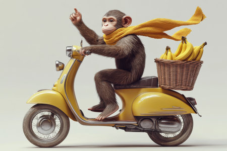 A cartoon monkey carries a basket of bananas on a scooter, highlighted on a white background. 3d illustration.