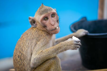 Monkey. Crab-eating macaque. Asia Thailand seats on the shore of the monkey island
