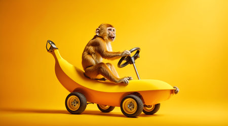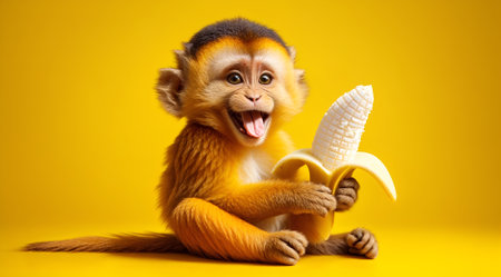 A monkey is holding a banana in its mouth while sitting on a yellow surface. The scene is playful and lighthearted, with the monkey's actions suggesting a sense of fun and enjoyment
