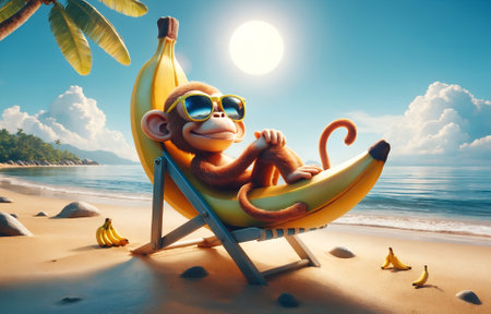 a monkey wearing sunglasses, sitting on a beach chair shaped like a banana