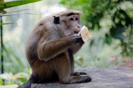 Close-Up of Rhesus Macaque Eating Banana in Tropical Forest