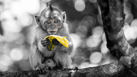 Baby monkey sitting on a tree and eating a banana in black and white (and selective yellow)