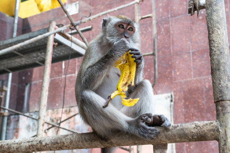 Monkey sitting and peeling banana in kuala lumpur malaysia